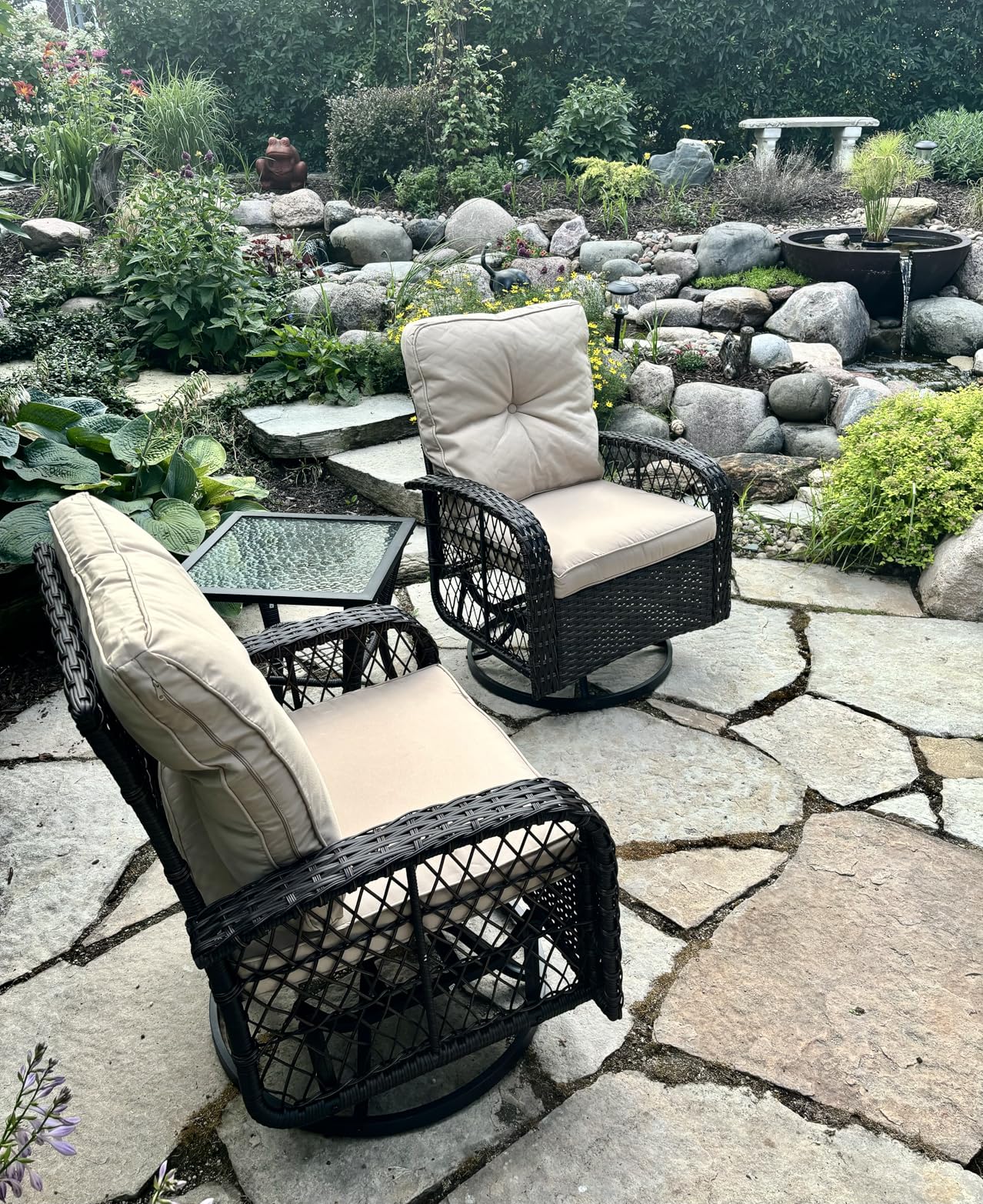 This furniture set stands out due to its unique combination of style, comfort, and durability. The 360° swivel rocking chairs allow for easy movement and interaction, making it convenient to reach for items or chat with friends without getting up. The stylish side table with its tempered glass top not only provides a practical surface but also adds a touch of sophistication to your outdoor space.