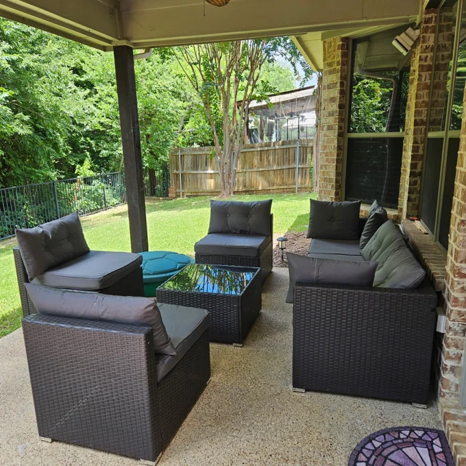 so happy with my purchase guys!!! 👏😊 didn't know i needed this outdoor set until i got it. now we spend more time outside than inside haha! the quality is superb, very solid and durable. cushions are comfy too. can't wait for summer to have all my friends over!