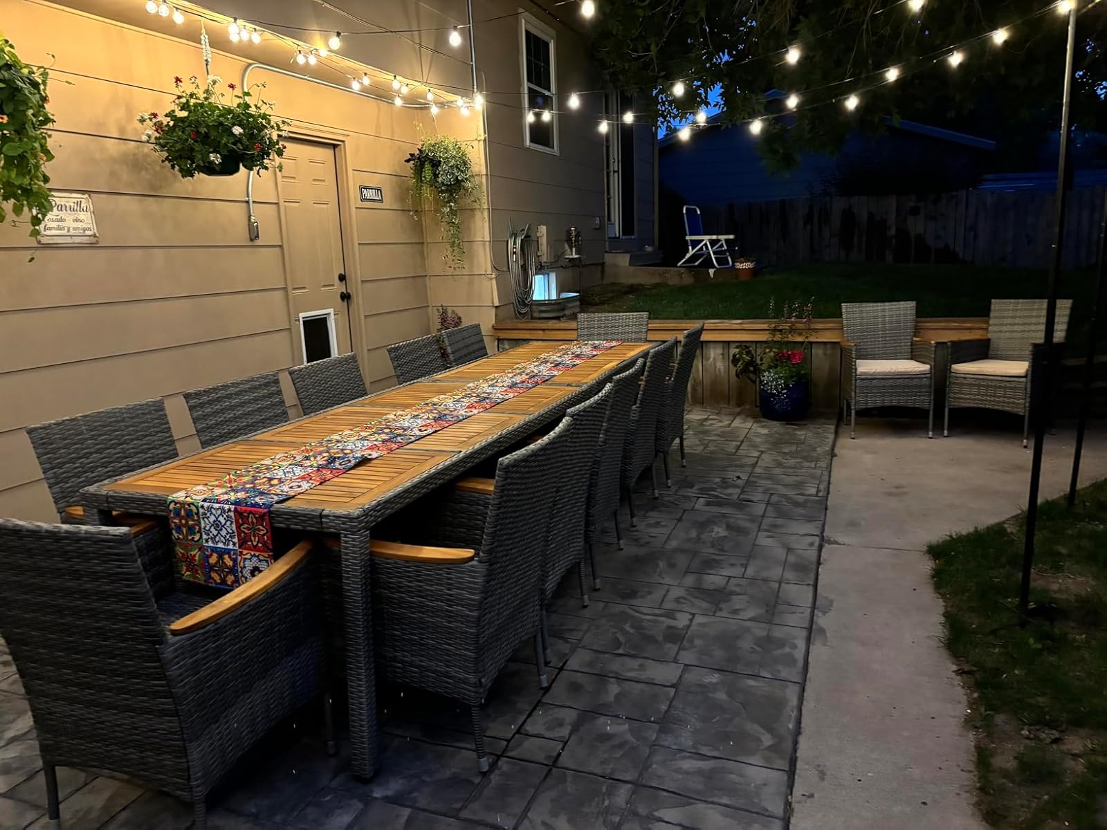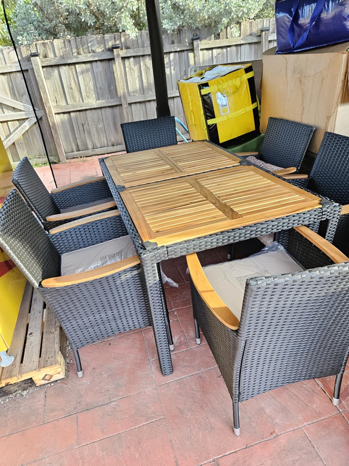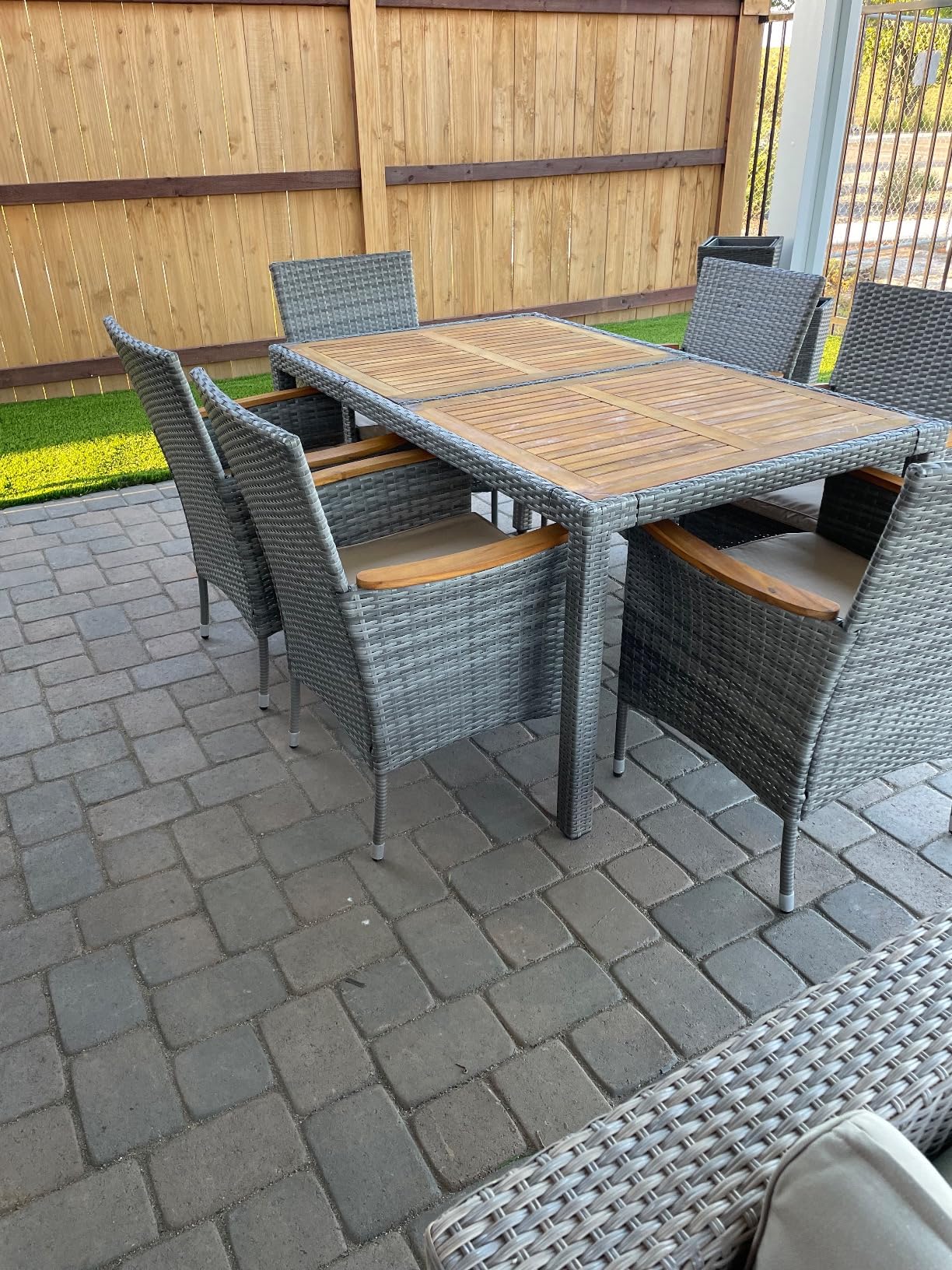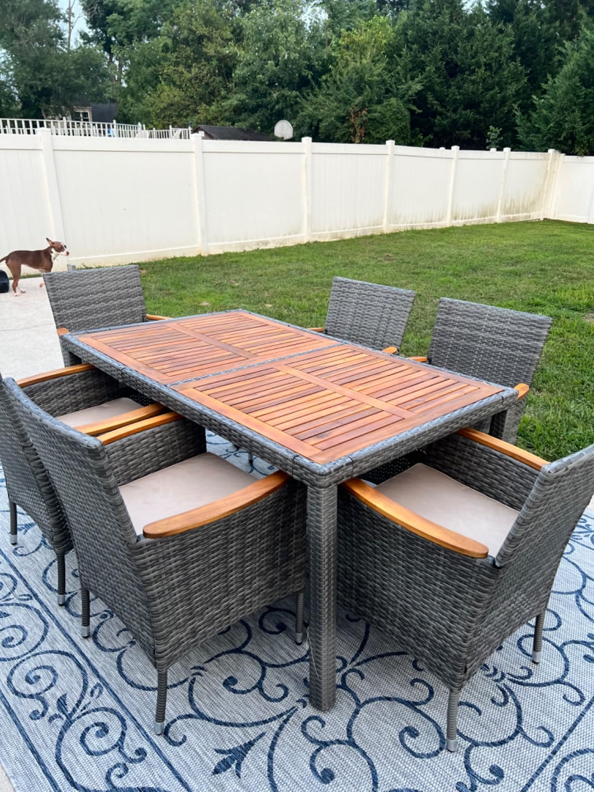 Who knew functionality could be this stylish? This outdoor dining set combines durability with elegance perfectly – exactly what our backyard needed! We're now able to host BBQs comfortably with plenty of room for everyone’s plates & glasses.