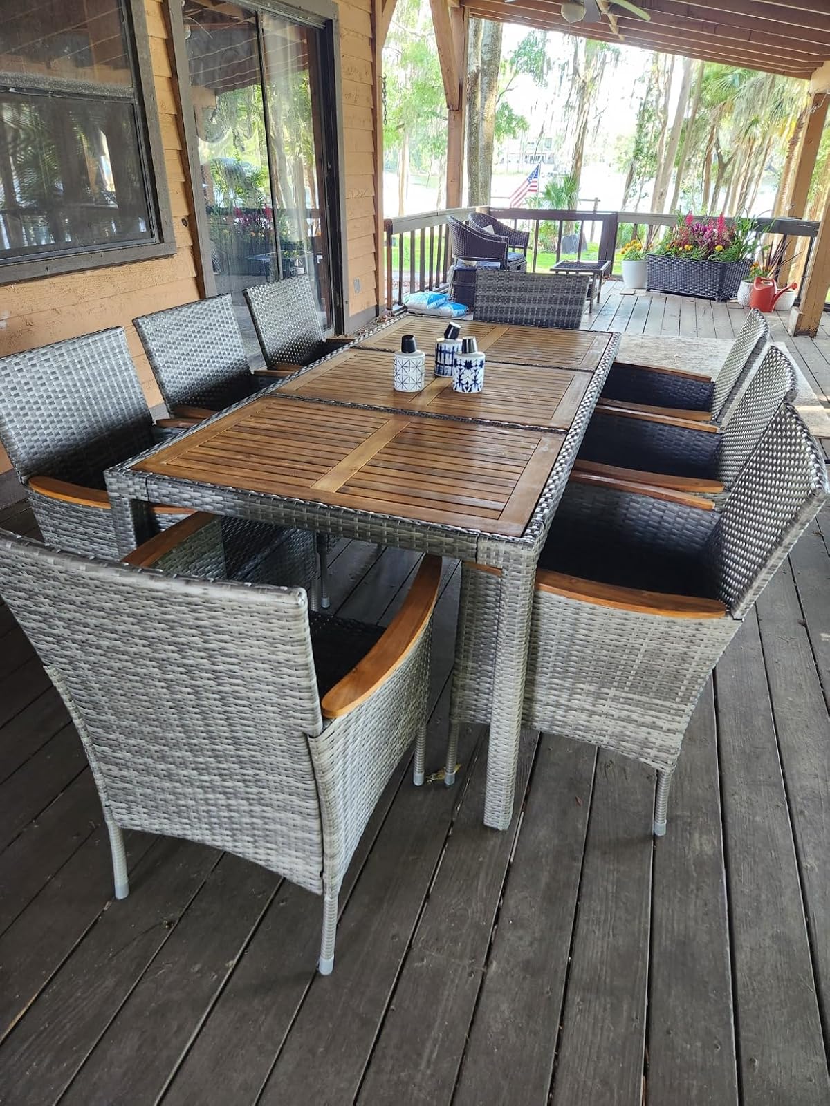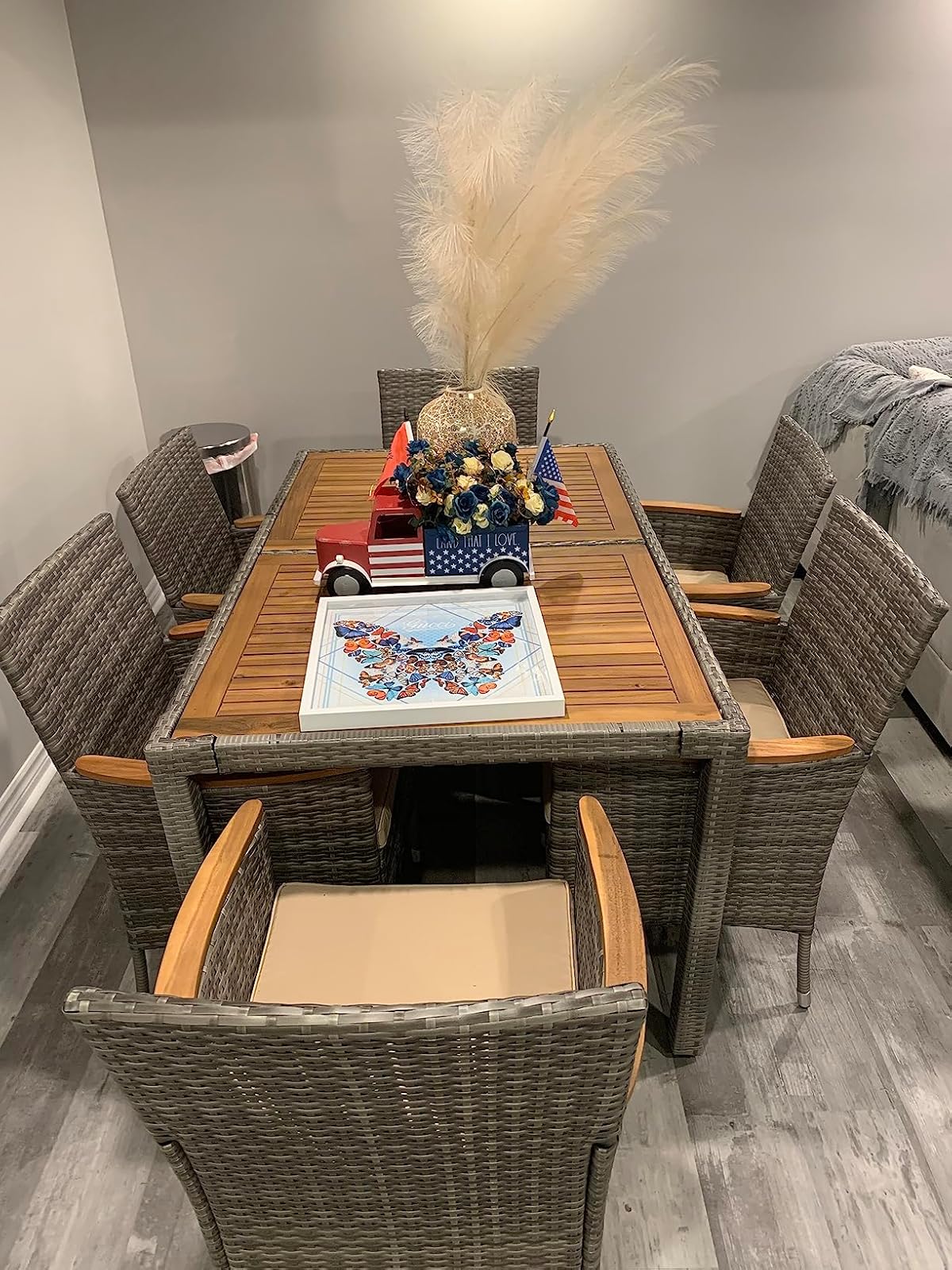 This outdoor dining set has transformed our backyard into a cozy oasis. It's not only functional but also incredibly stylish with its durable wicker construction and elegant Acacia wood tabletop. A perfect addition to any patio!