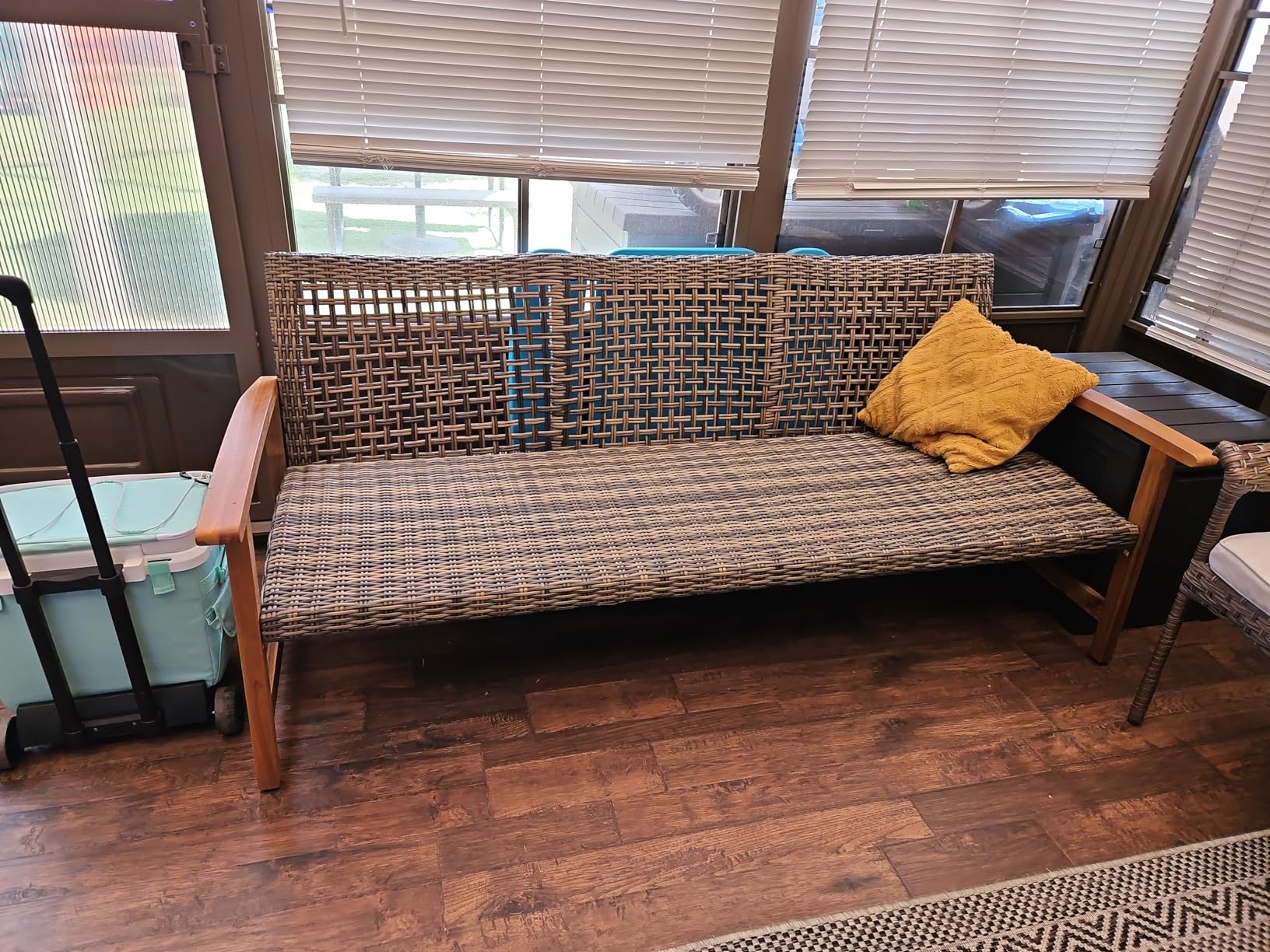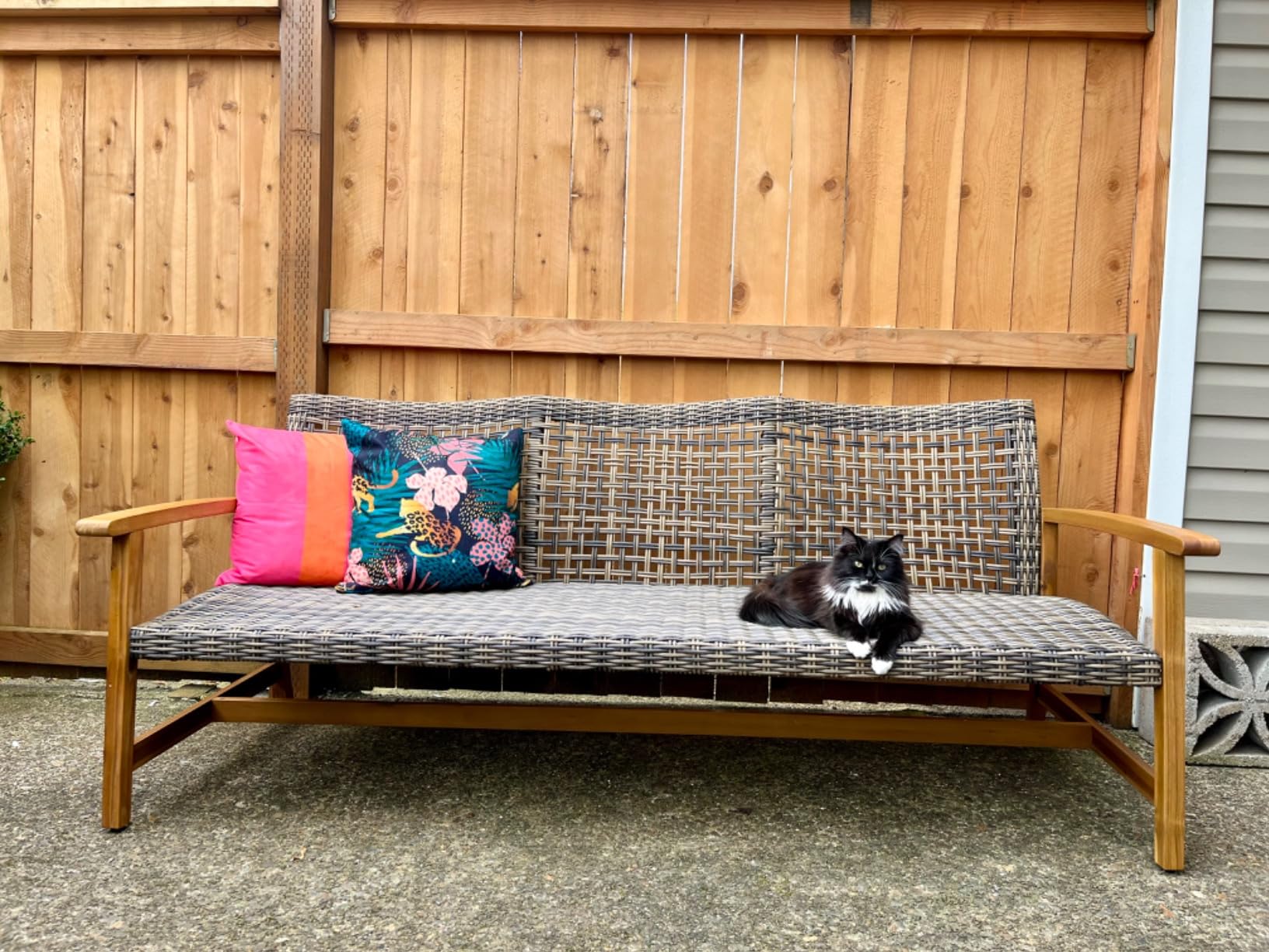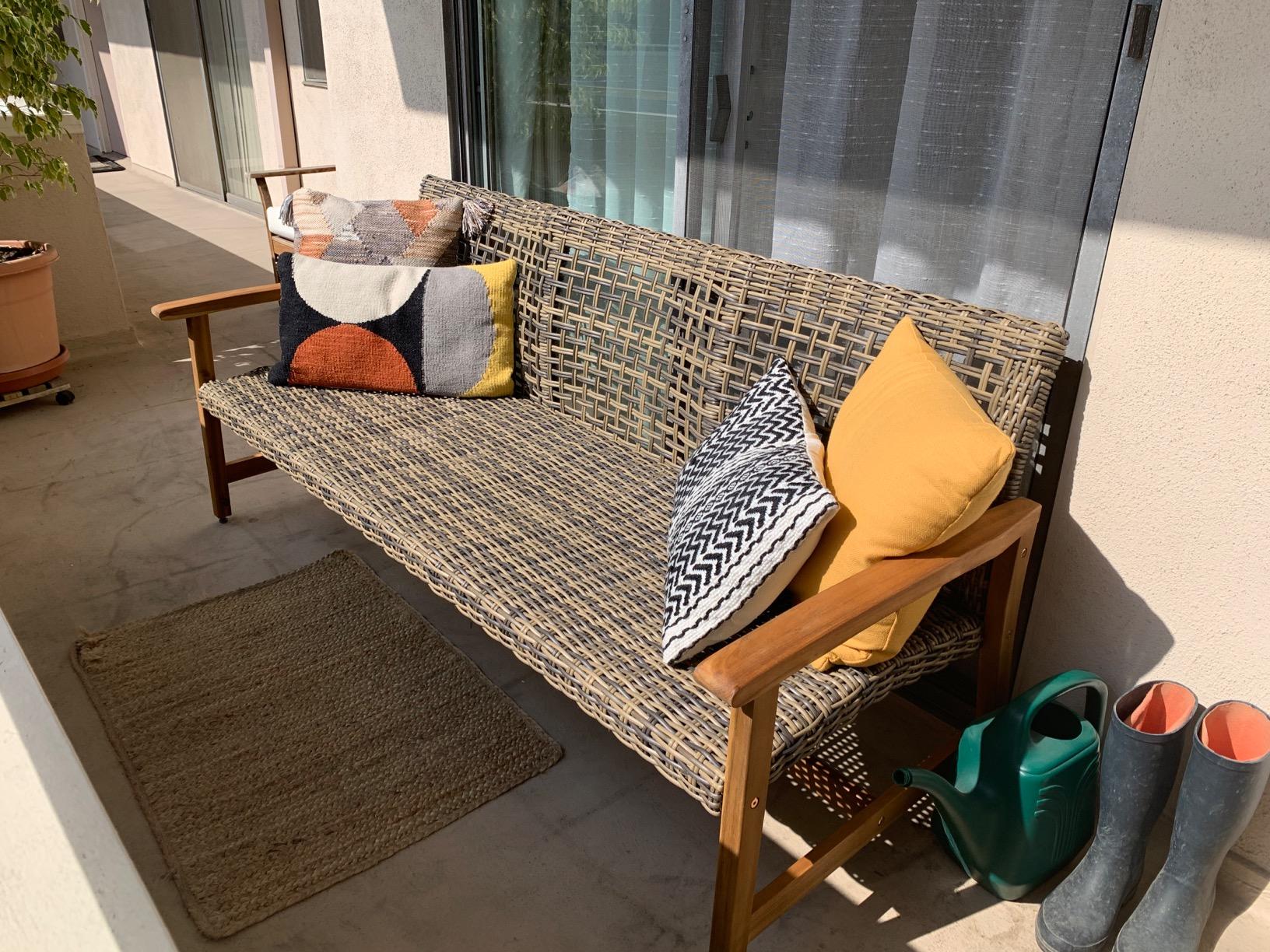 I love the design of this sofa, especially the handwoven wicker. It’s comfortable for three people, and the wood frame blends nicely with my outdoor decor. I deducted one star because the iron accents had a small scratch, but otherwise, it's a great piece.