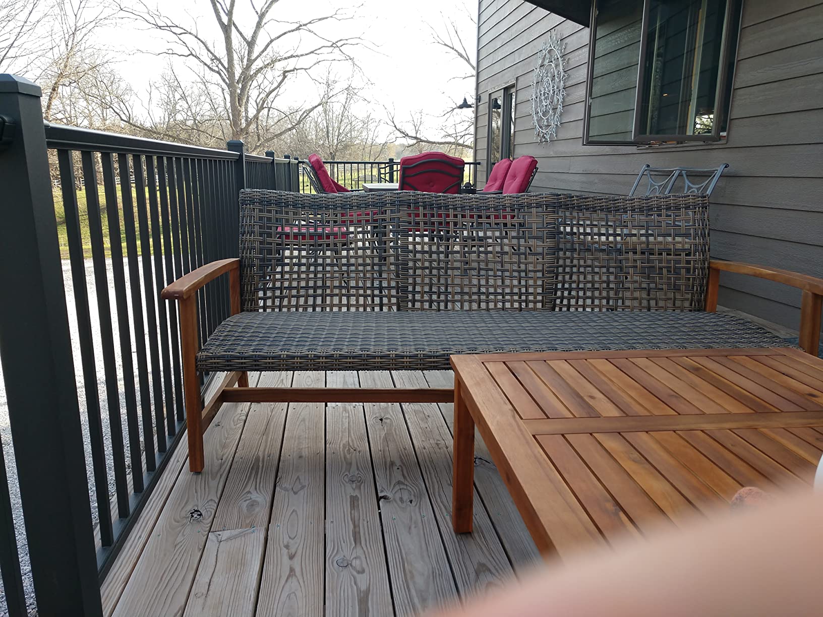 This outdoor wood sofa with wicker seating has exceeded all my expectations. It's sturdy, comfortable, spacious, and looks great in any setting. I especially love how the natural stained finish of the acacia wood frame blends seamlessly with my other outdoor furniture.
