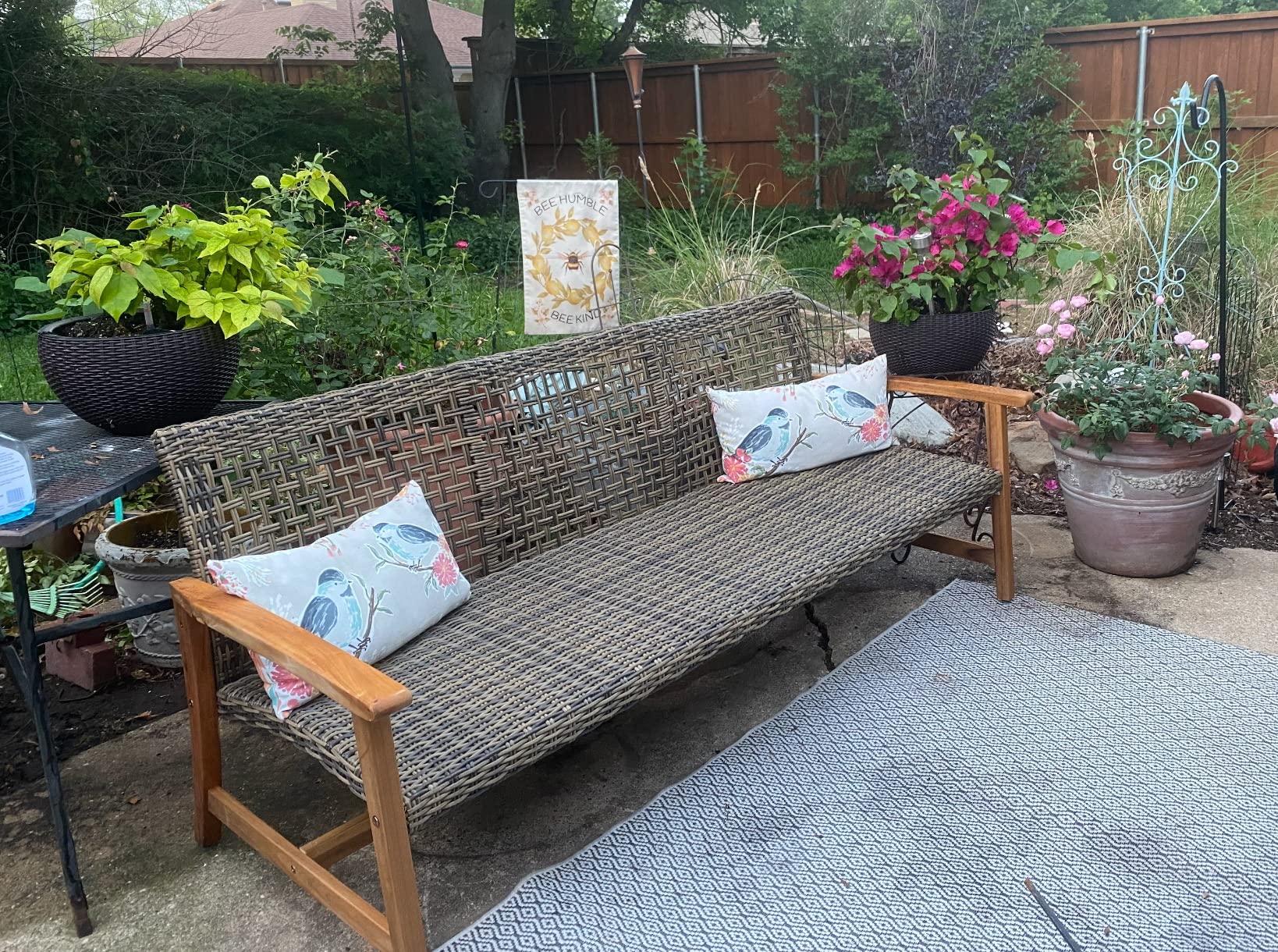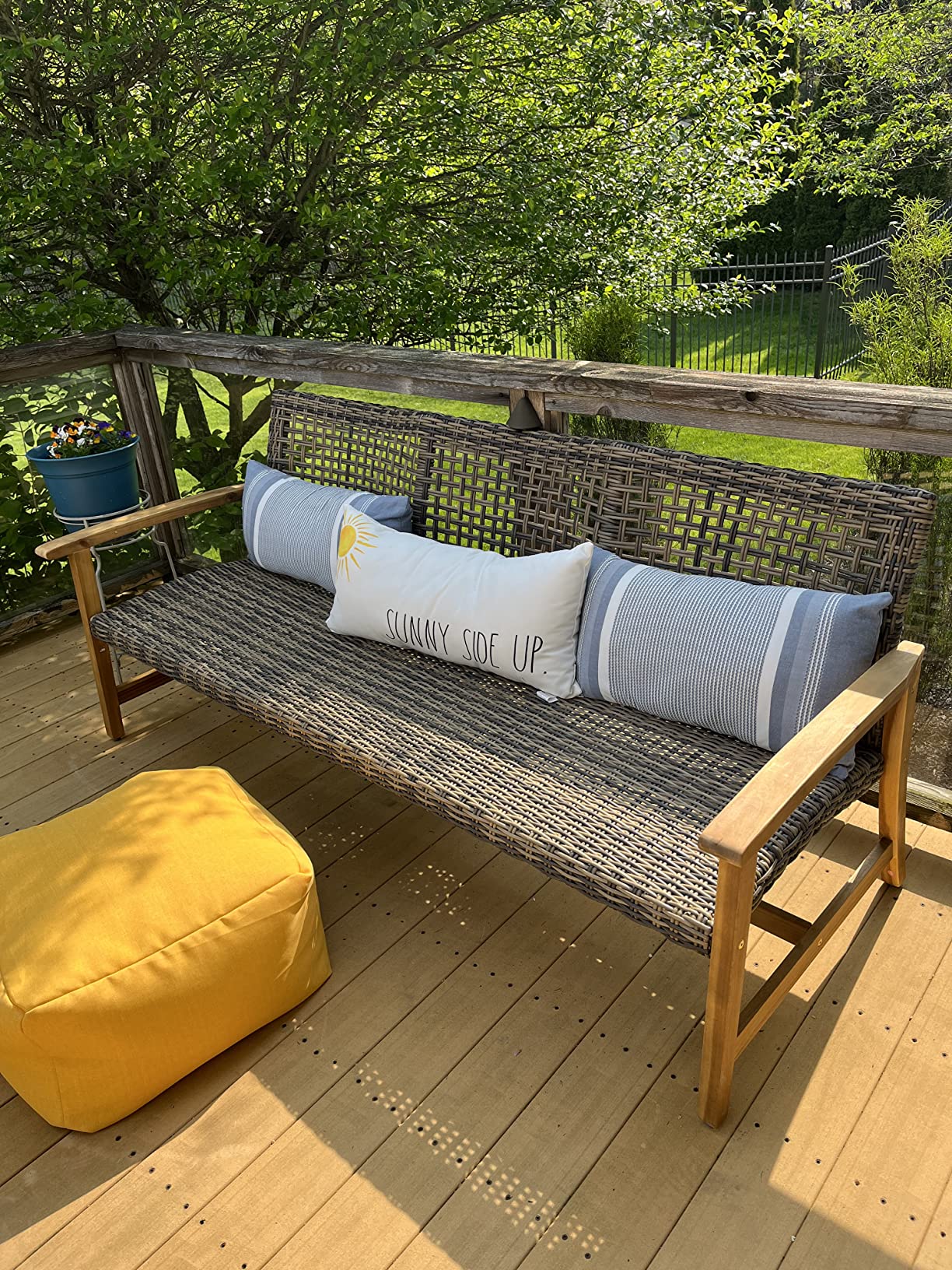 The large seating area is perfect for three people, and the iron accents add a nice touch of durability. My only gripe is that the wicker could be a tad softer, but it's still great for outdoor use.